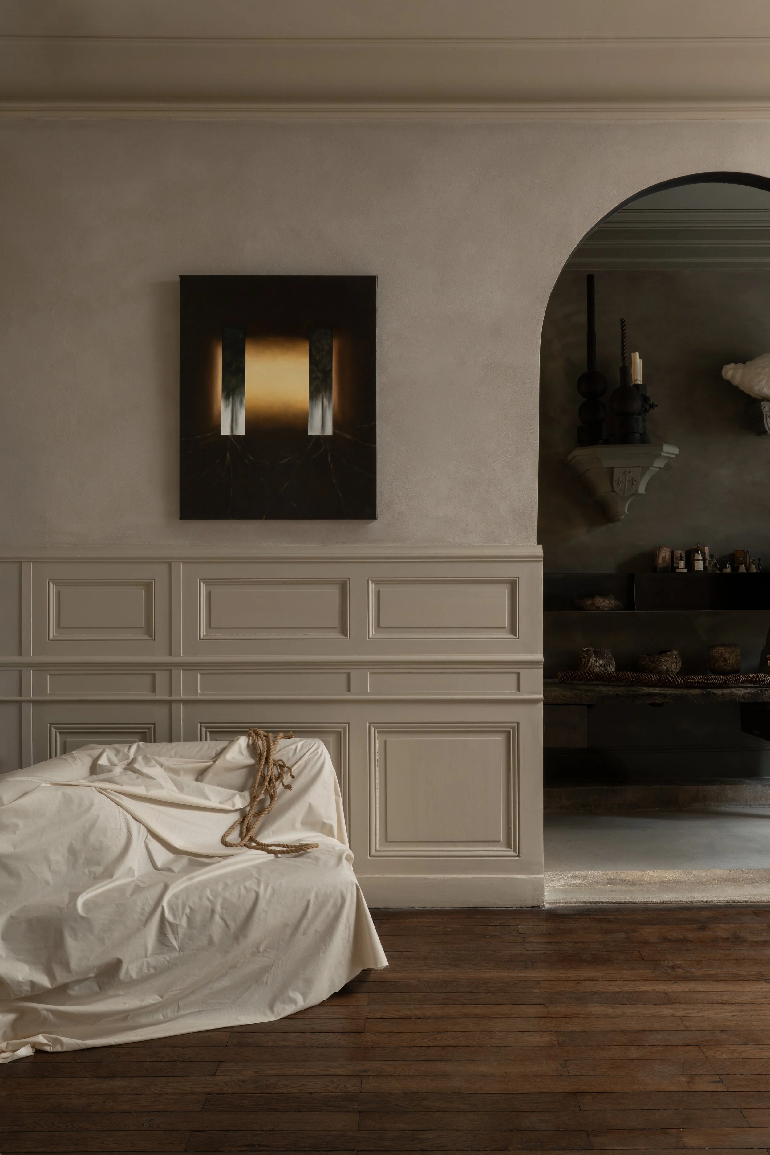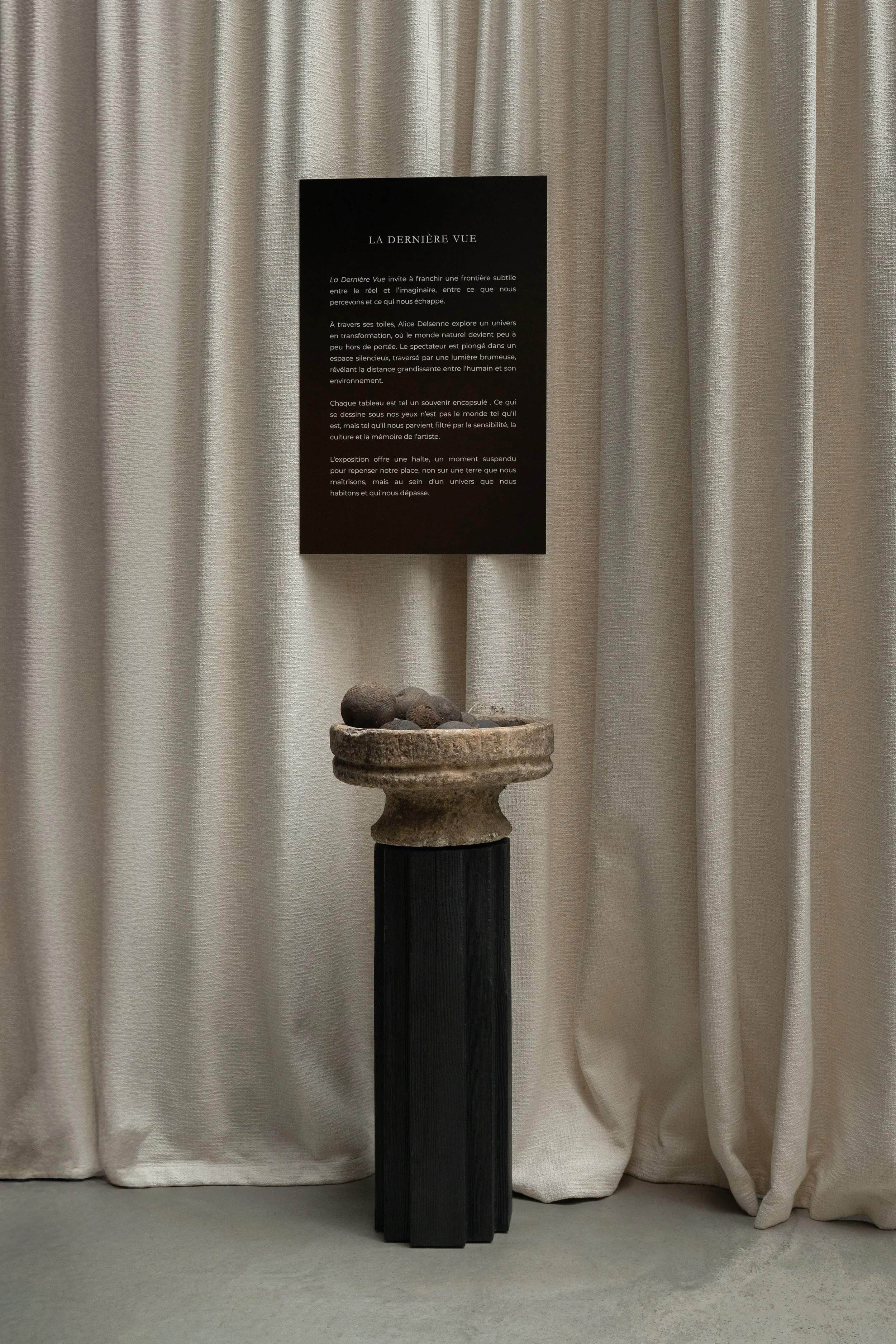 With a scenography by Coutume Studio, the paintings are shown in a still, mysterious space, caught between two realities.